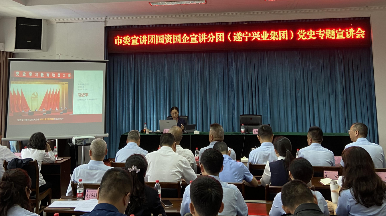 ? ? 5月11日,市委宣講團(tuán)第十分團(tuán)成員、市委黨校教研室主任屈燕走進(jìn)遂寧興業(yè)集團(tuán),開展黨史學(xué)習(xí)教育專題宣講。集團(tuán)公司及各直屬企業(yè)領(lǐng)導(dǎo)班子成員、中層干部,以及黨員和基層員工代表聆聽了宣講。集團(tuán)公司黨委委員、紀(jì)委書記蔡坤辰主持宣講會并對下一階段黨史學(xué)習(xí)教育提出要求。
